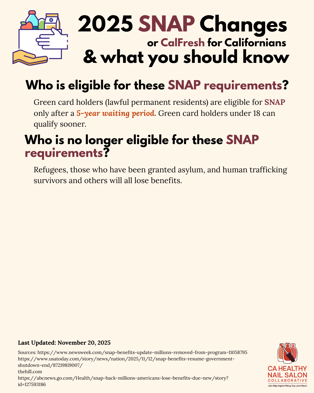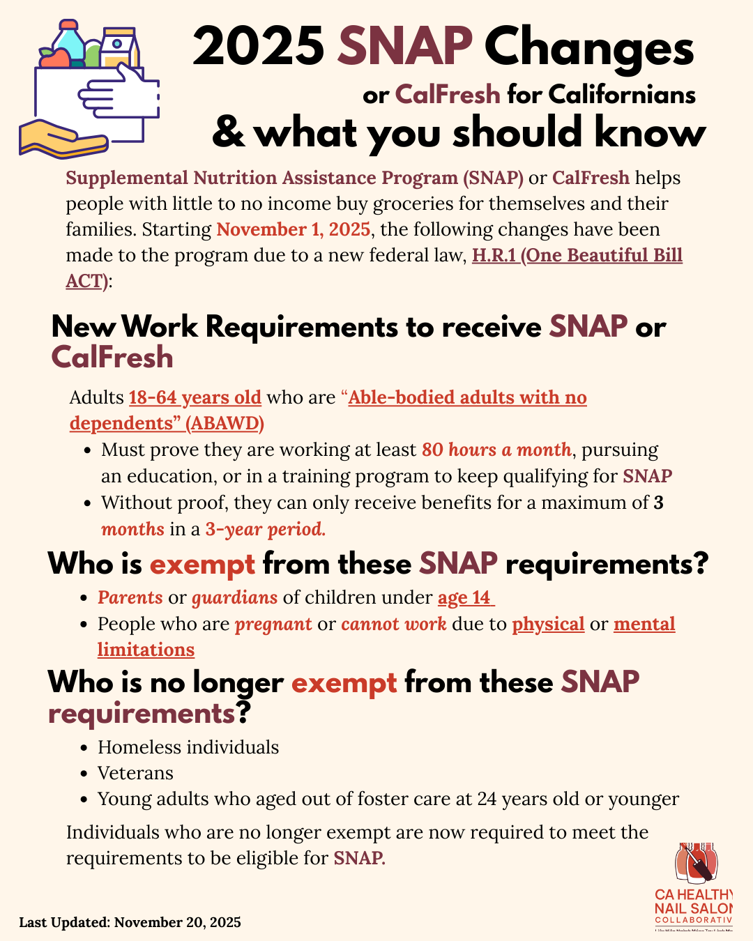 These are SNAP changes that may impact your or your loved ones’ benefits. We will update these as policy changes come. If you would like to learn more about essential resources, please reach out to us at info@cahealthynailsalons.org.